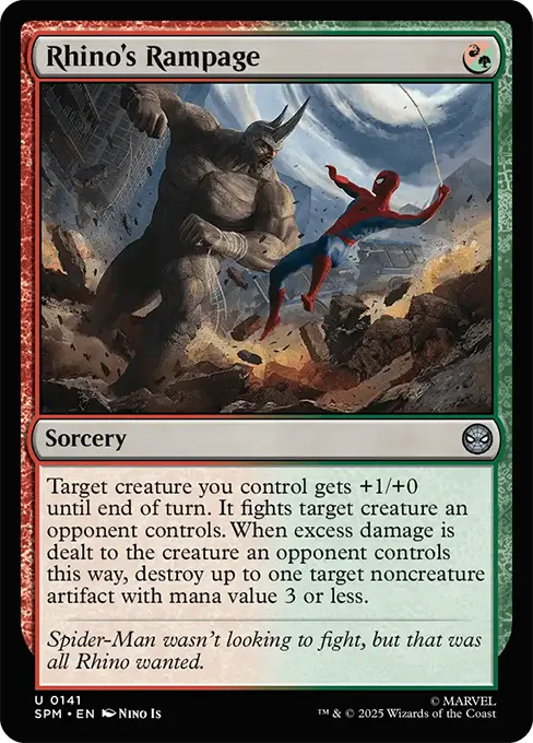 目標由你操控的生物得+1/+0直到回合結束。它與目標由對手操控的生物互鬥。當該由對手操控的生物以此法受到過量傷害時,消滅至多一個目標魔法力值等於或小於3的非生物神器。