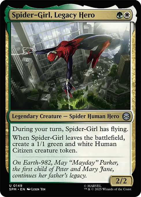 當蜘蛛女孩離開戰場時,派出一個1/1,綠白雙色的人類/市民衍生生物。
