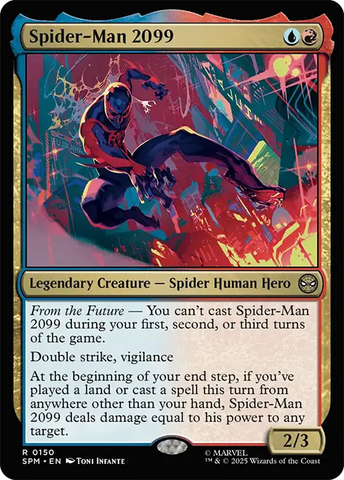 在你的結束步驟開始時,若你本回合中從你手牌以外的任何區域使用過地或施放過咒語,則蜘蛛人2099對任意一個目標造成等同於他力量的傷害。