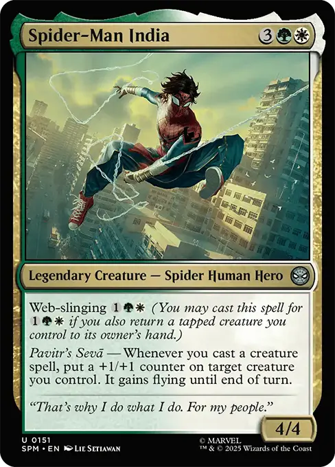 蛛絲甩蕩{1}{G}{W}(如果你額外將一個由你操控且已橫置的生物移回其擁有者手上,則可以支付{1}{G}{W}來施放此咒語。)