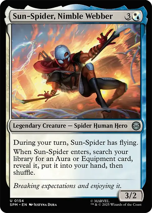 當太陽蜘蛛人進場時,從你牌庫中搜尋一張靈氣或武具牌,展示該牌,將它置於你手上,然後洗牌。