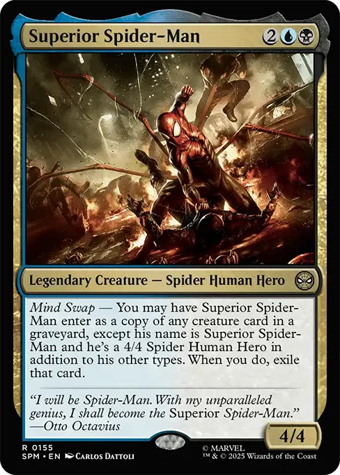 交換心智~你可以使究極蜘蛛人當成任一墳墓場中的生物牌之複製品來進戰場,但他的名稱仍是究極蜘蛛人,且是4/4蜘蛛/人類/英雄,並仍具有原本類別。當你如此作時,放逐該牌。