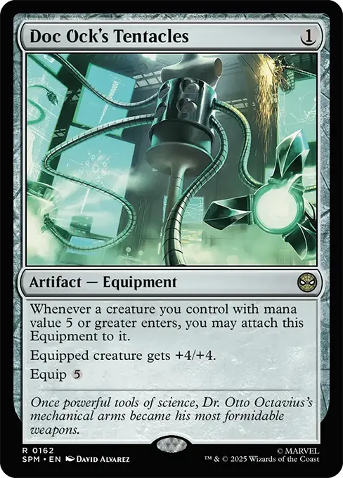 每當一個由你操控且魔法力值等於或大於5的生物進場時,你可以將此武具貼附於其上。
