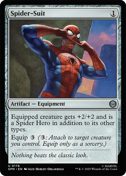佩帶此武具的生物得+2/+2,且額外具有「蜘蛛/英雄」此兩個類別。