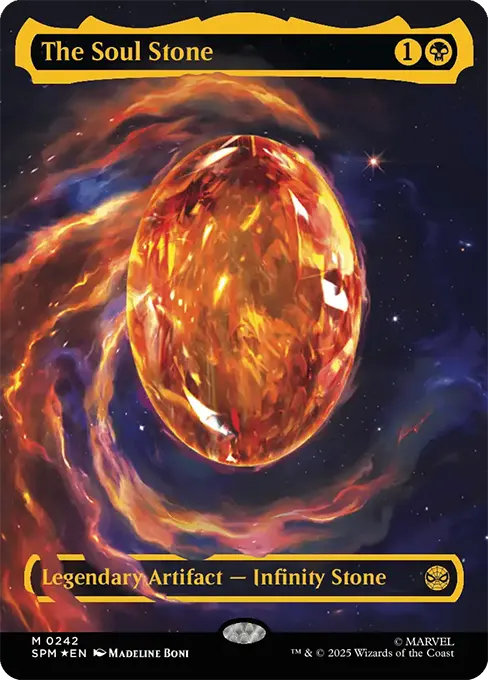 傳奇神器 – 無限/原石不滅{T}:加{B}。{6}{B},{T},放逐一個由你操控的生物:掌控靈魂寶石。(一旦受掌控後,其∞異能便會生效。)∞~在你維持開始時,將目標生物牌從你墳墓場移回戰場。