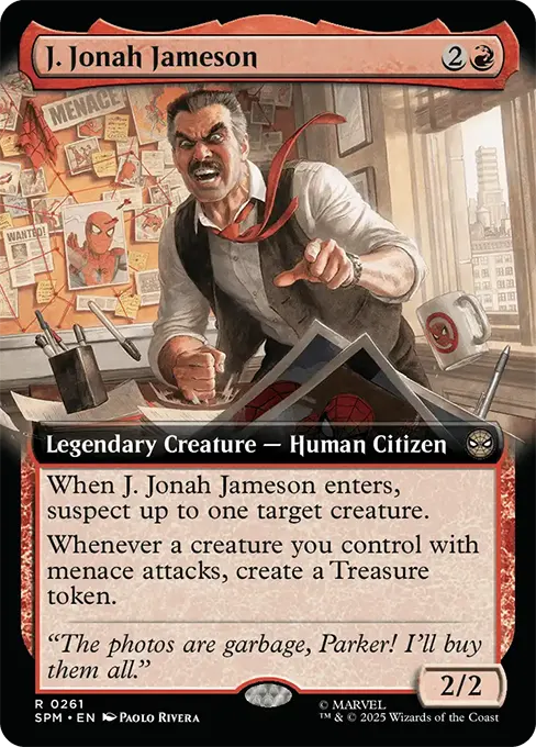 當J·喬納·詹姆森進場時,懷疑至多一個目標生物。(已遭疑的生物具有威懾異能且不能進行阻擋。)