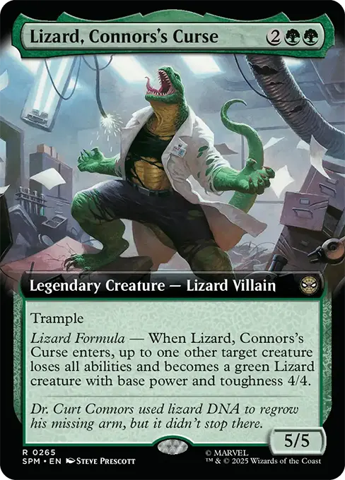 蜥蜴配方~當康納斯之異變蜥蜴教授進場時,至多另一個目標生物失去所有異能,併成為基礎力量與防禦力為4/4的綠色蜥蜴生物。