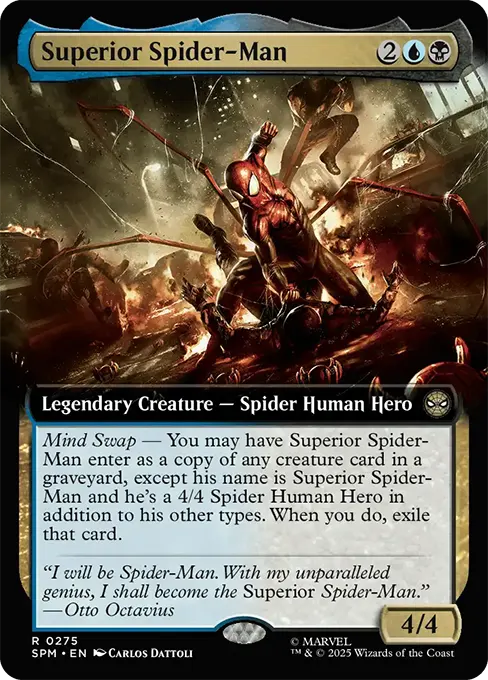 交換心智~你可以使究極蜘蛛人當成任一墳墓場中的生物牌之複製品來進戰場,但他的名稱仍是究極蜘蛛人,且是4/4蜘蛛/人類/英雄,並仍具有原本類別。當你如此作時,放逐該牌。