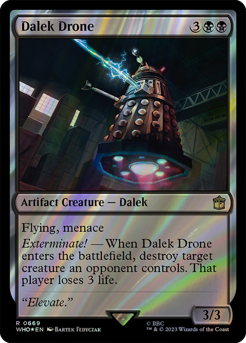 消滅!~當戴立克無人機進場時,消滅目標由對手操控的生物。該玩家失去3點生命。